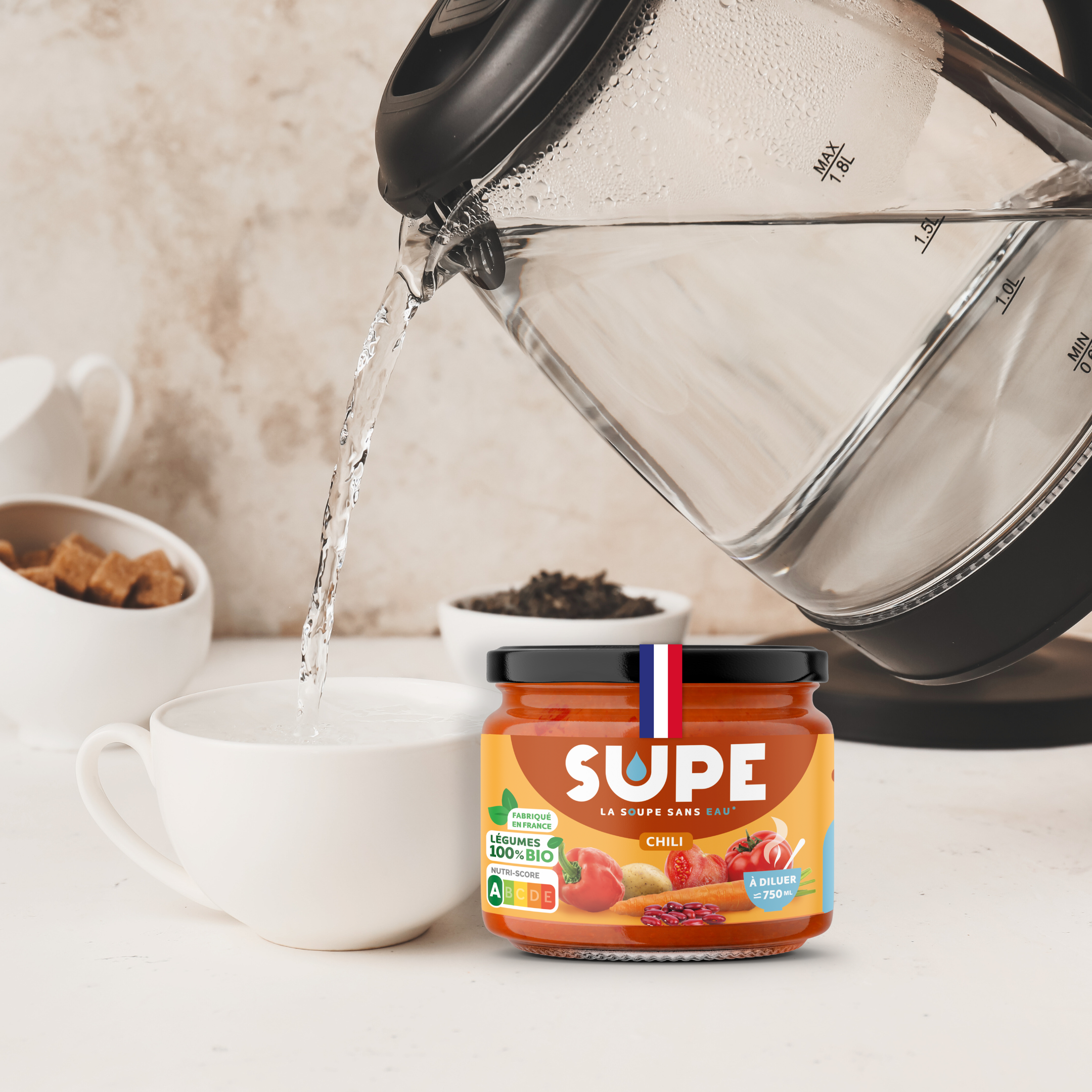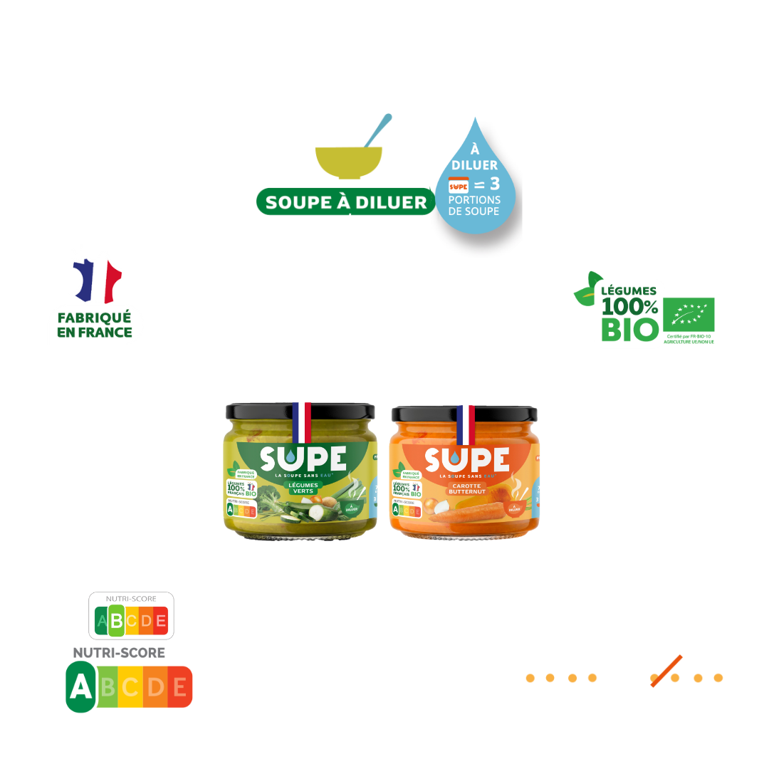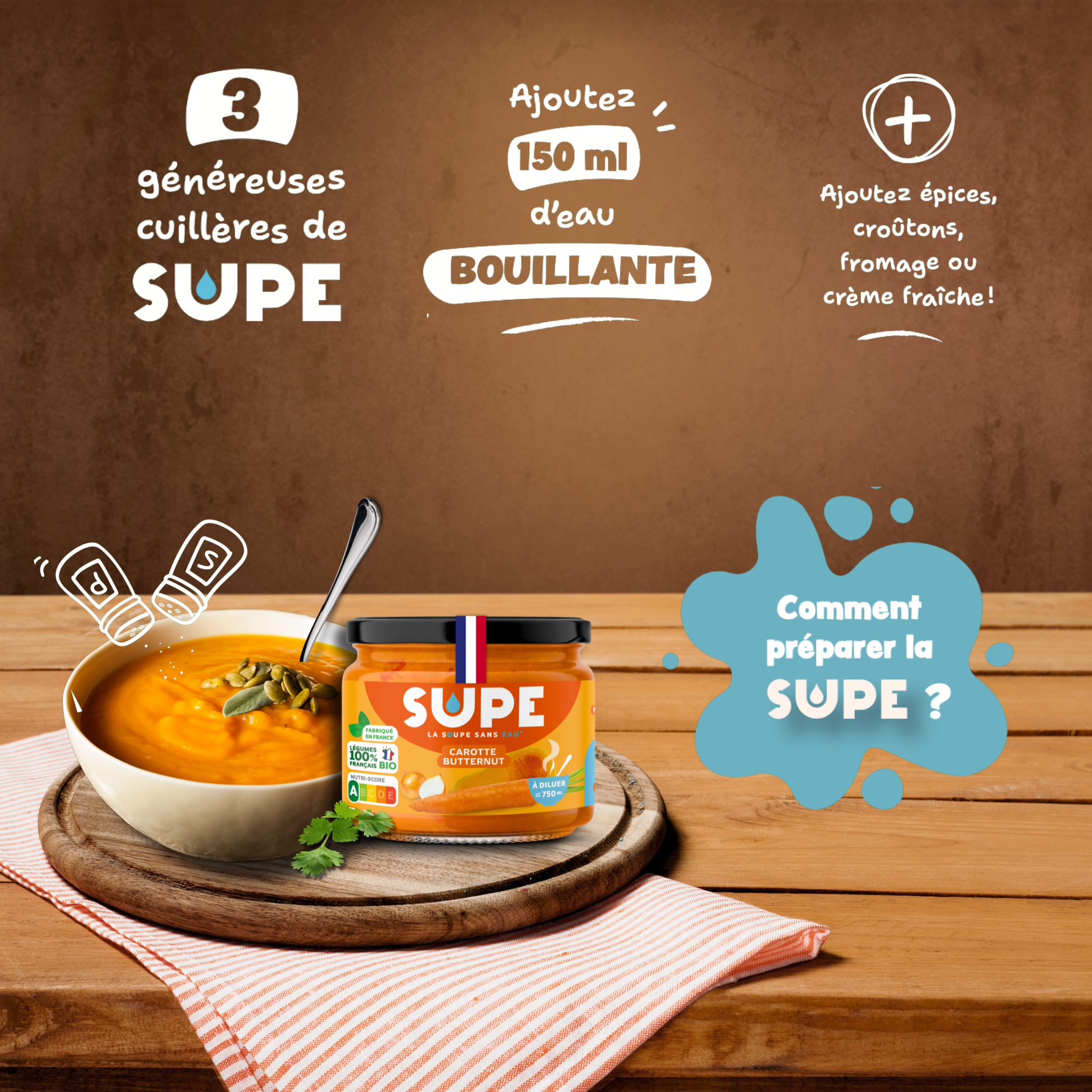 Fabriquée en France à partir de légumes 100 % bio cultivés sur notre territoire, la SUPE mise sur l'essentiel : un concentré de saveurs et de bienfaits, sans eau.
